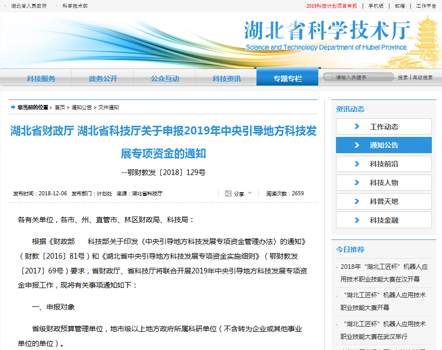 根據(jù)《財政部 科技部關(guān)于印發(fā)〈中央引導(dǎo)地方科技發(fā)展專項資金管理辦法〉的通知》(財教〔2016〕81號)和《湖北省中央引導(dǎo)地方科技發(fā)展專項資金實施細(xì)則》(鄂財教發(fā)〔2017〕69號)要求,省財政廳、省科技廳將聯(lián)合開展2019年中央引導(dǎo)地方科技發(fā)展專項資金申報工作,現(xiàn)將有關(guān)事項通知如下: