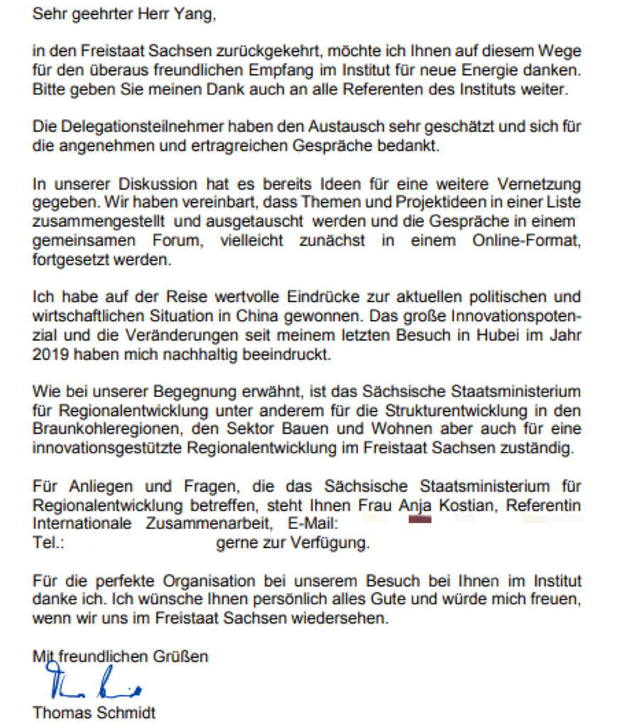 回到薩克森自由州后,我想通過(guò)這個(gè)機(jī)會(huì)對(duì)您和新能源研究院的熱情接待表示感謝,也請(qǐng)將我的感謝轉(zhuǎn)達(dá)給新能源研究院的所有工作人員。