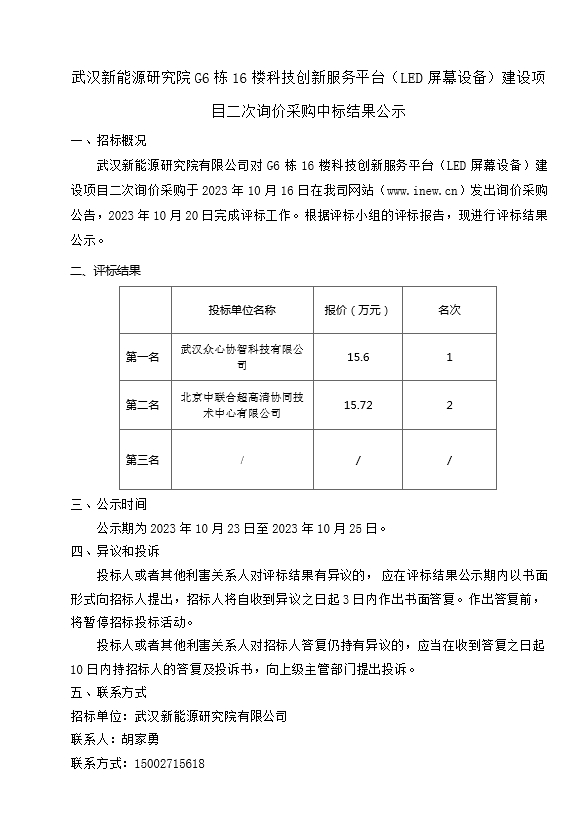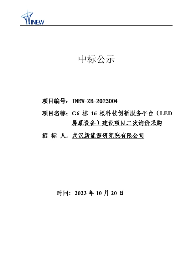 G6棟16樓科技創(chuàng)新服務平臺(LED屏幕設備)建設項目二次詢價采購中標公示