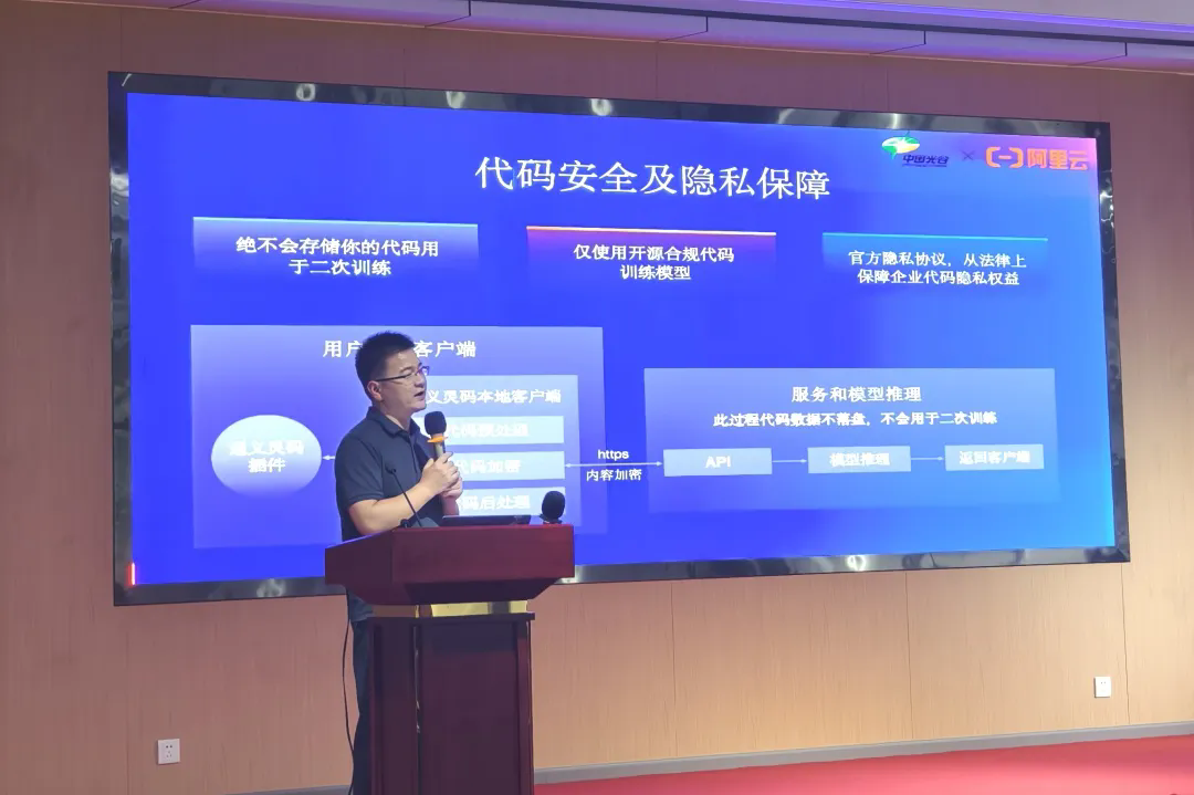 “基于CPU應(yīng)用范式和基于GPU的模型智能體范式,加速融合形成了企業(yè)IT架構(gòu)新范式?!鞍⒗镌浦悄芗瘓F(tuán)AI解決方案高級(jí)架構(gòu)師郭文皓,演示了在大模型時(shí)代,阿里云百煉平臺(tái)定義新應(yīng)用范式,接入更多商業(yè)化模型。阿里云智能集團(tuán)通義靈碼產(chǎn)品專家洪永潮,講述了通義靈碼當(dāng)前在企業(yè)側(cè)的實(shí)踐應(yīng)用效果以及產(chǎn)品實(shí)操演示。
